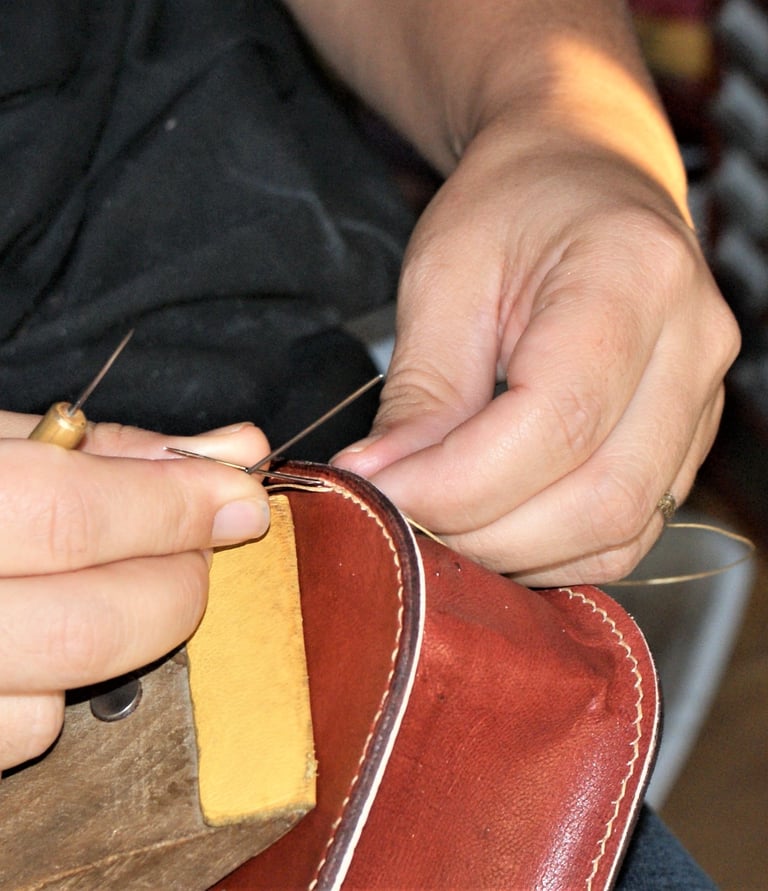 L’inspiration de Céline naît de la richesse des cuirs qu’elle sélectionne avec exigence : cuir souple ou rigide, lisse ou texturé… Si la majorité de ses créations sont en cuir de veau et cousues à la machine à coudre, Céline aime également le cuir à tannage végétal, qu’elle travaille entièrement à la main : gravure, teinture, couture… Pour celui-ci, elle utilise des outils traditionnels comme la pince sellier, l’alêne losange ou le couteau demi-lune.
